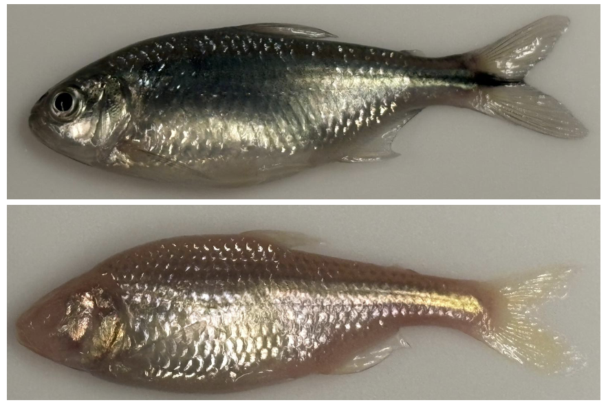 Fig. 1. The Mexican tetra, Astyanax mexicanus is a vertebrate fish that exists as two morphotypes: ancestral surface fish (top), and at least 30 populations of cave-adapted, blind cavefish (bottom).