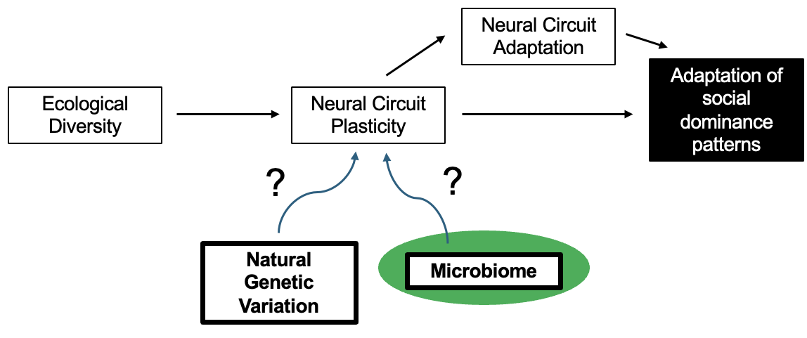 Fig. 3. The mechanisms underlying social behavior adaptation are multifactorial, including natural genetic variation, and potentially gut microbiome diversity.