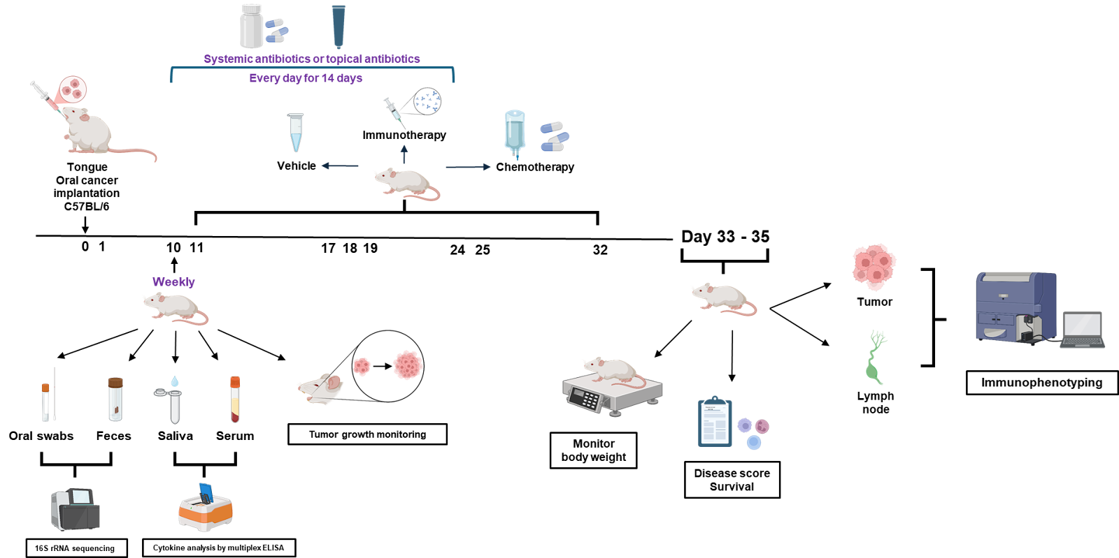 - Test antibiotics in mouse models of oropharyngeal cancer to see how oral and topical (on the tongue) antibiotics affect tumor growth, immune responses, and cancer treatment responses.
